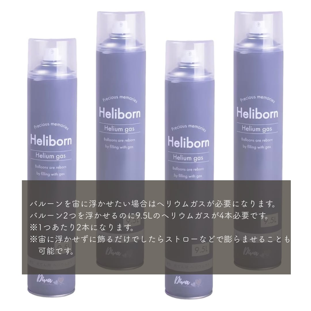 一つのバルーンを膨らませるのに一般的なヘリウムガスのボトル9.5Lが2本必要となります。
